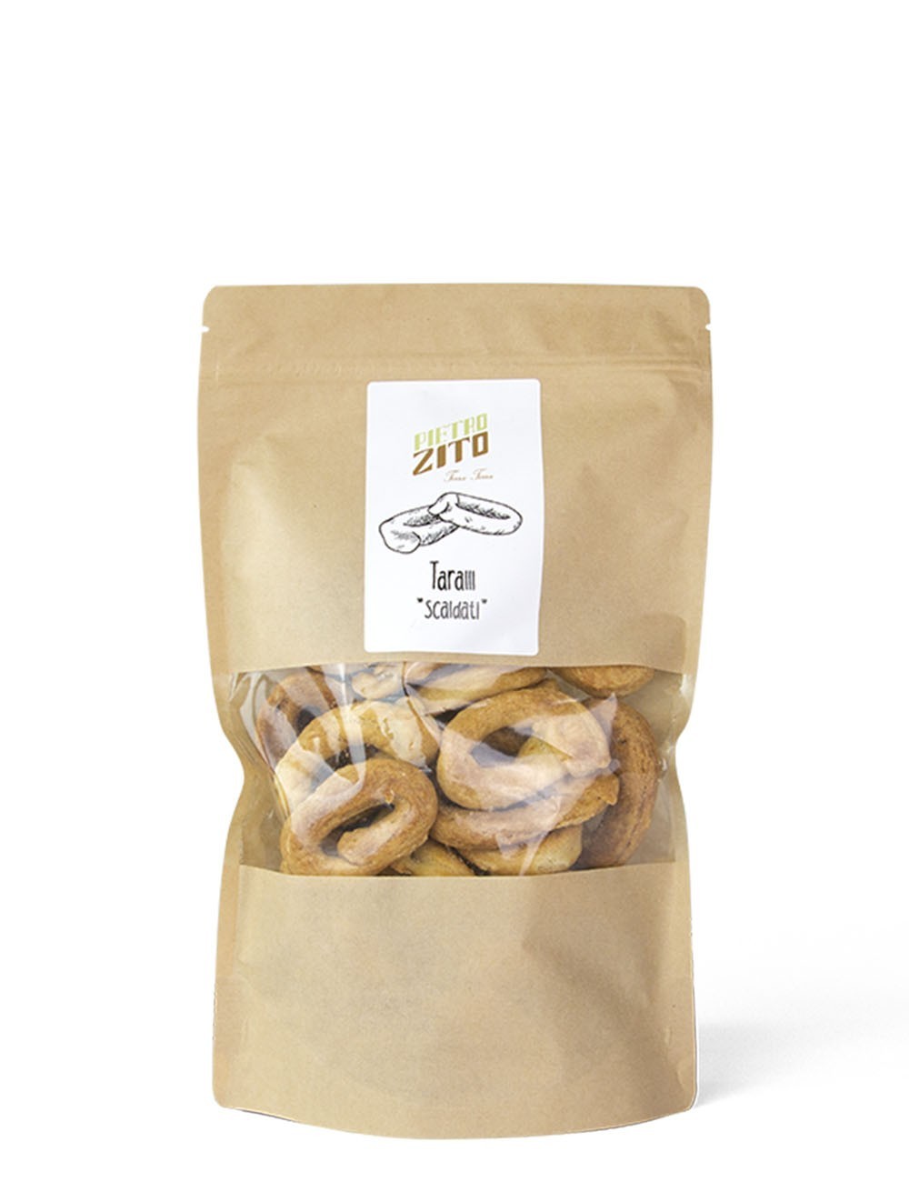 La forma irregolare del tarallo è la prima evidenza dell’artigianalità del prodotto per cui realmente ognuno di essi viene legato uno per uno a mano. Il segreto della sua bontà, invece, risiede nel suo ingrediente principe, l’olio extravergine di oliva coratina. Grazie ad esso il tarallo assume una colorazione dorata dovuta al punto fumo classico dell’olio extravergine di oliva (la colorazione bianca del tarallo, al contrario, evidenzia con certezza la presenza di altri tipi di olio, non extravergine). I nostri taralli sono impastati solo con olio extravergine (quasi 300gr. per kg.di farina) e vino bianco senza alcuna aggiunta di acqua. La maggiore quantità di olio lo rende in assoluto più buono, ma sua lavorazione diventa più difficile. La bollitura del prodotto (scaldatelli) avviene ancora come si faceva una volta, ovvero attraverso l’uso di un bollitore tradizionale.