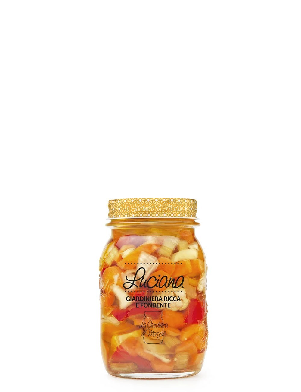 La Giardiniera di Luciana nasce dalla voglia di creare una versione opulenta in olio ricca e avvolgente, dove la mescola delle verdure acquisisce ulteriore sapore e ricchezza con la presenza di cipolla e sedano. Anche qui come nella versione di Morgan, tutte le verdure sono tagliate a mano, cotte separatamente e fatte maturare nella bagna agrodolce per 10 giorni per poi essere messe via in vaso con l’aggiunta dell'olio.